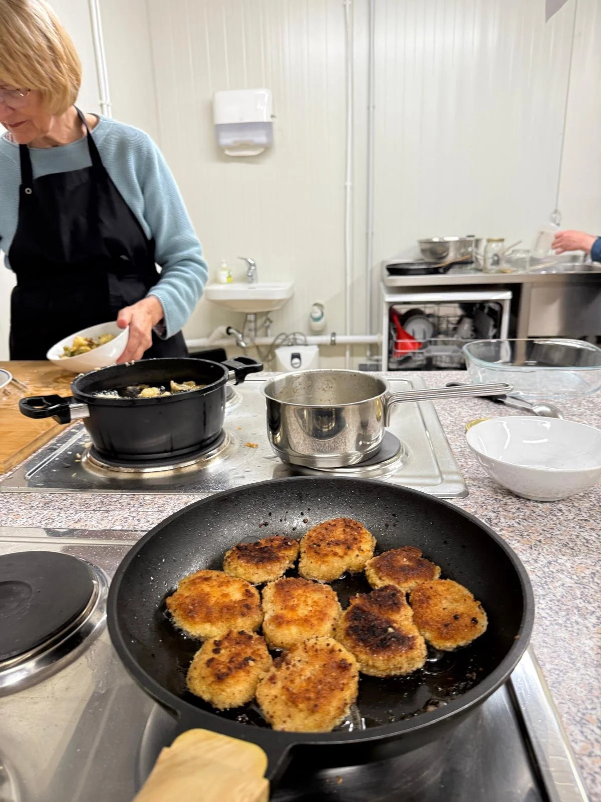 Pom Pom Blanc, Ei, Falafel oder Pankomehl, Bratöl, Salz, Pfeffer, Zitronensaft